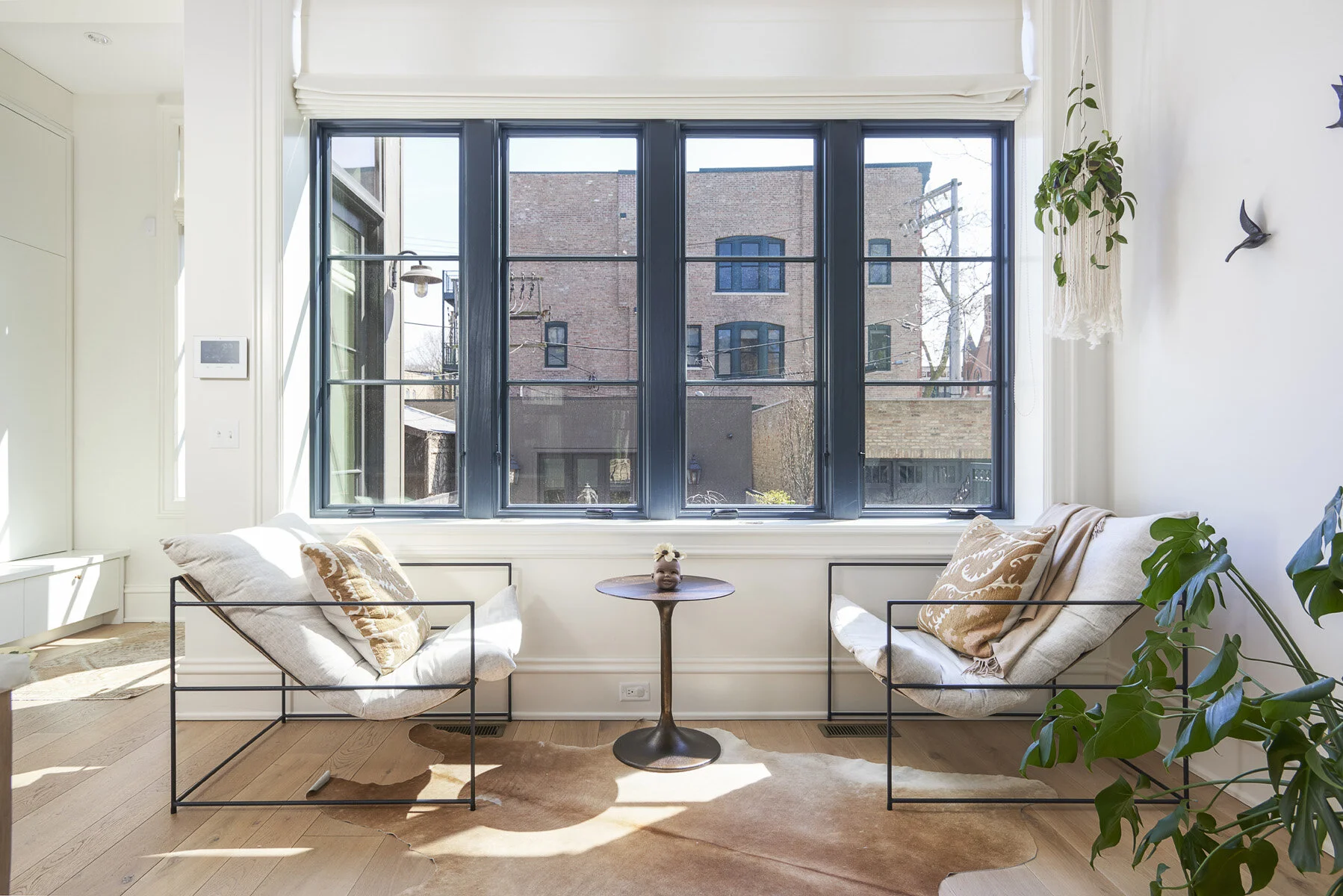 This project is a gut rehab and addition to a historic 19th century Wicker Park rowhouse. While the front exterior façade was restored, a clean-lined but sensitive addition was added to the back. The interior was transformed from an outdated space into a beautiful, bright, and fresh contemporary home. Removing the partition walls between the stair hall and living spaces creates a much more spacious Living Room, Dining Room and Kitchen. It also allows for natural light from the newly added rear windows and the front bay windows to flood the entire first floor. A refreshing, crisp color palette with predominantly white walls, natural accents and dark, bold windows accentuates the transparency and airiness of the well-lit interior.
